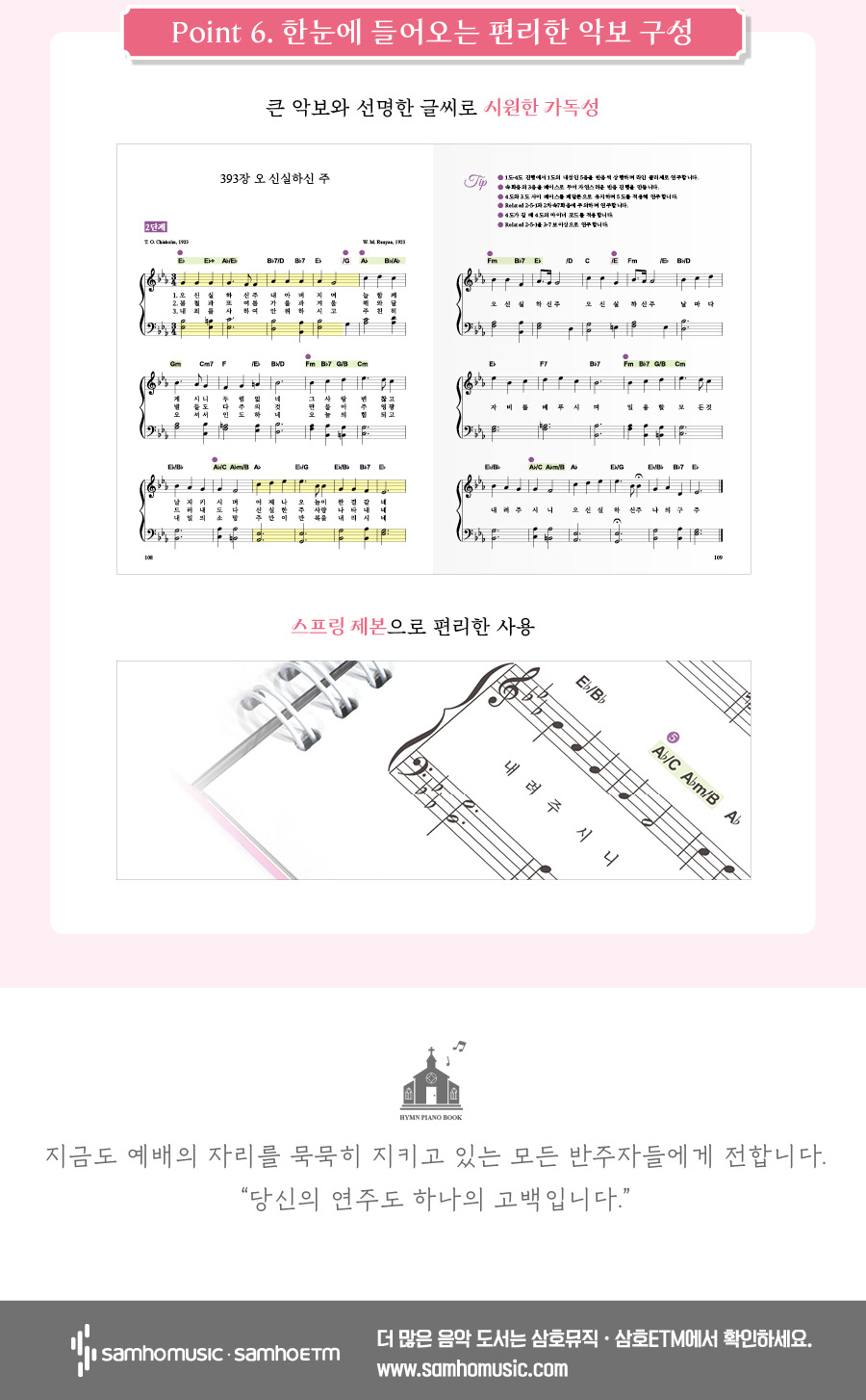 이와 함께 큰 악보와 선명한 글씨로 가독성을 높였으며, 스프링 제본 형태로 예배와 연습에서 더욱 편리하게 사용할 수 있습니다.