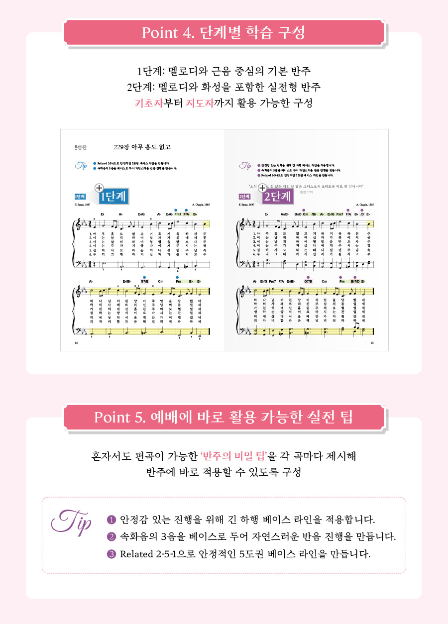 또한 조성과 장 순서에 따른 목차 구성, 절기와 예배 순서를 나타내는 아이콘 표기로 원하는 곡을 빠르게 찾을 수 있습니다. 각 곡은 1단계와 2단계로 나누어 수록되어 있어 기초자와 지도자 모두 활용할 수 있으며, 곡별 전주 구간을 노란색 띠로 제시하여 예배 현장에서의 활용도를 높였습니다. 더불어 혼자서도 다양한 반주를 만들 수 있도록 ‘반주의 비밀 팁’을 함께 수록하여 실제 반주에 바로 적용할 수 있는 아이디어를 제공합니다.