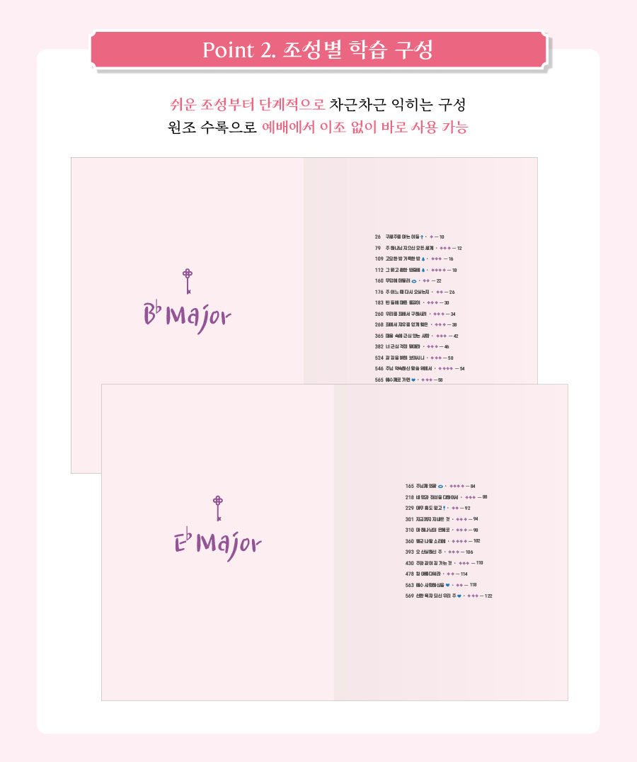 이 책은 쉬운 조성부터 단계적으로 익힐 수 있는 체계적인 구성으로, 반주 실력을 차근차근 향상시킬 수 있도록 돕습니다. 모든 곡을 원조로 수록하여 별도의 이조 없이 예배에서 바로 사용할 수 있으며, 곡별 난이도가 표시되어 있어 자신의 연주 수준에 맞게 선택해 연습할 수 있습니다.