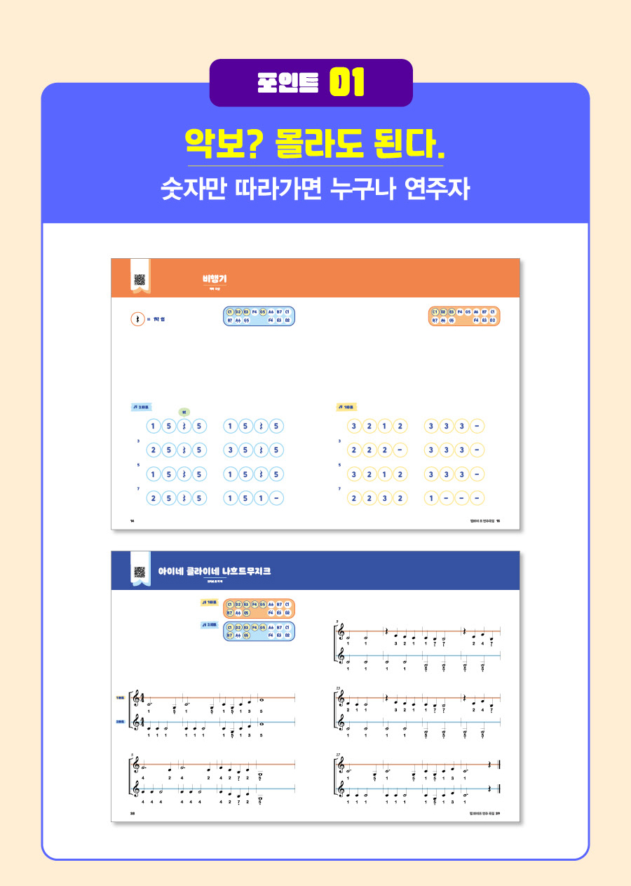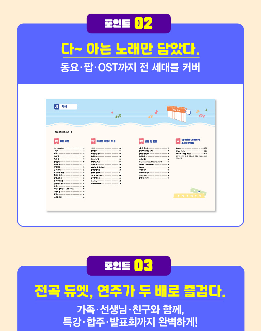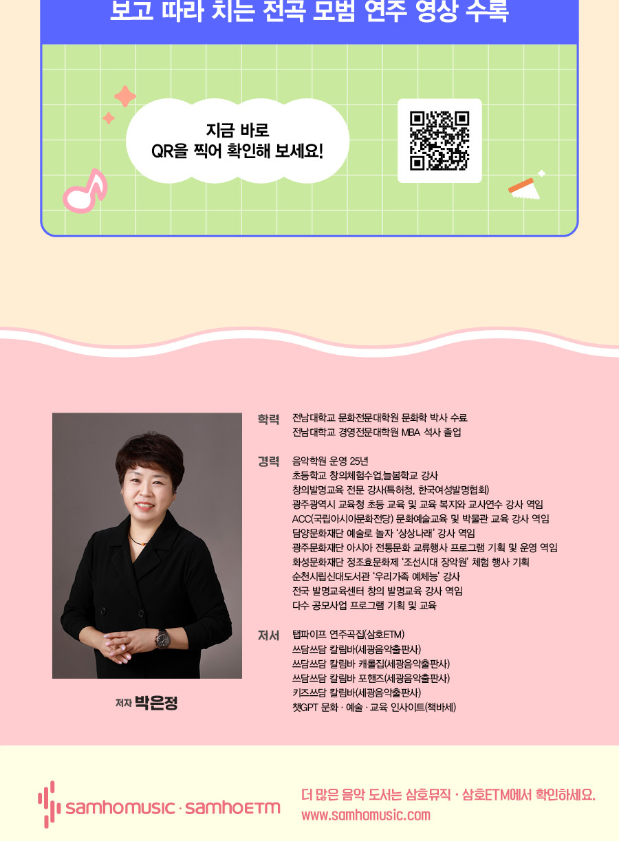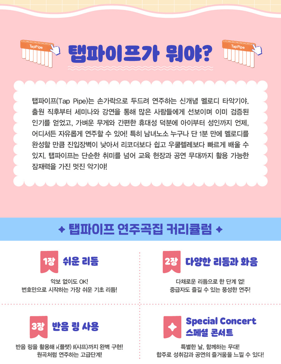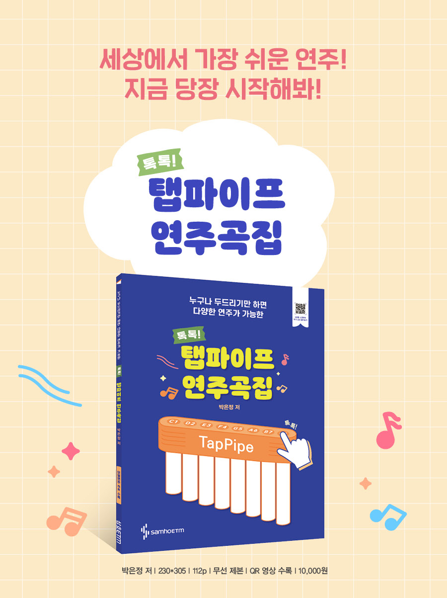 왕초보도 단번에 소리를 낼 수 있는 『탭파이프 연주곡집』은 특강·단체수업·발표회까지 한 번에 활용 가능한 신개념 교재입니다. 건반이나 현악기의 복잡한 구조 대신, 손끝으로 톡톡 두드리며 누구나 음악의 즐거움을 바로 경험할 수 있도록 설계했습니다. 이 책은 전곡 QR 모범 연주 영상을 수록해 처음 배우는 아이도, 가르치는 원장님도 쉽고 빠르게 곡을 익히며 완성도 있는 연주를 만들 수 있습니다. 동요, 클래식 ,OST까지 다양한 레퍼토리를 담아 학부모는 만족하고, 아이들은 즐겁고, 원장님은 수업 준비가 쉬워집니다. ‘배움의 벽’을 낮추고 ‘연주의 성취’를 높이는 『탭파이프 연주곡집』은 남녀노소 누구에게나 음악을 선물하는 가장 직관적이고 친절한 가이드북이 될 것입니다.