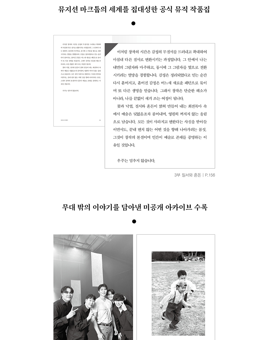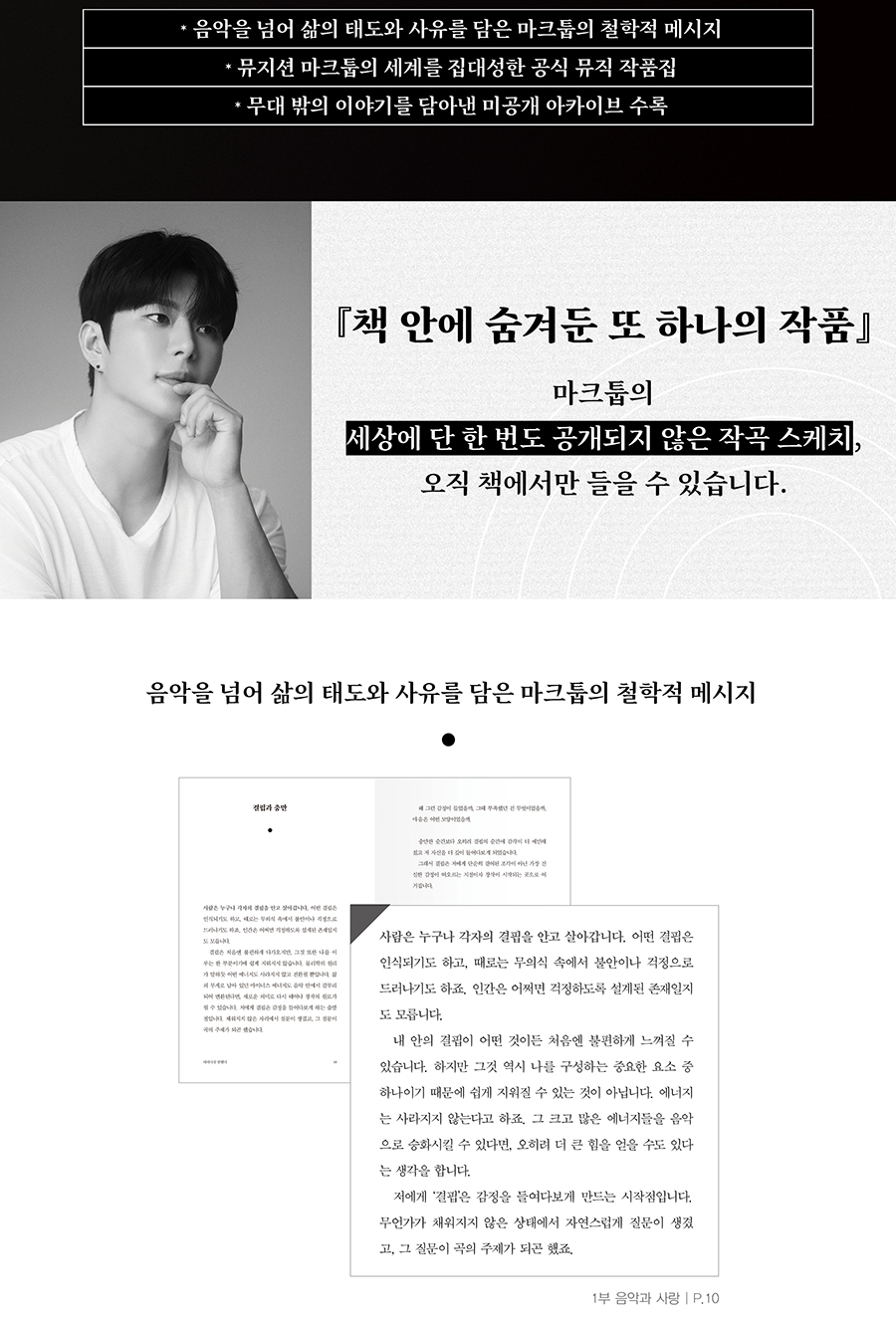 단순한 음악이 아닌 삶을 붙드는 손길. 뮤지션 마크툽의 첫 뮤직작품집이 출간되었다. 이번 책은 음악 기록을 넘어 노래와 글, 그리고 삶의 태도를 아우르는 뮤지션 마크툽의 세계를 집대성한 단행본이다. 책 속에는 그의 철학적 메시지와 음악적 사유가 담겨 있으며, 무대 안팎의 순간들을 기록한 아카이브가 수록되어 있어 독자들에게 새로운 감동을 전한다. 팬들에게는 소장가치 높은 뮤지션의 첫 작품집이자, 음악을 사랑하는 모든 이들에게는 읽고 듣는 새로운 뮤직 앨범이 될 것이다. 글과 기록을 통해 마크툽의 또 다른 목소리를 경험할 수 있다는 점도 특별하다. 특히 지금까지 어디에도 공개되지 않았던 미발표한 작곡 스케치가 QR코드로 수록되어 있어 오직 책을 통해서만 경험할 수 있는 특별한 선물이 된다.